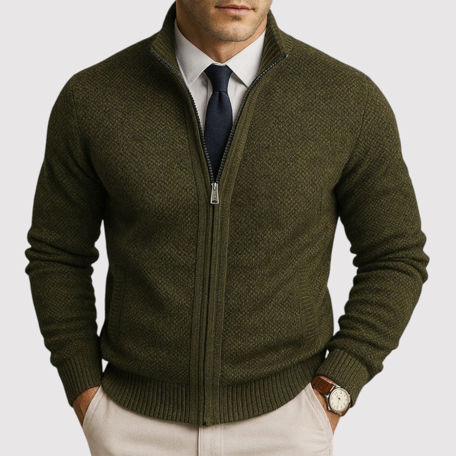 以沉穩自信開始每一天 — 這款高級拉鍊毛衣兼具優雅風格與舒適感,無論在辦公室、旅行中或週末,都能自然展現整潔的印象。