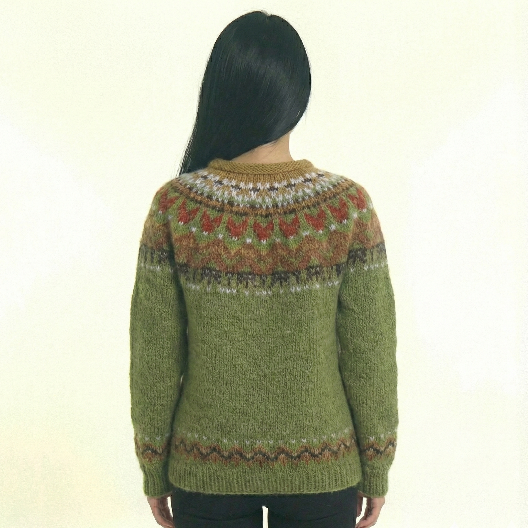 這款柔軟質感的中等重量毛衣採用大地橄欖色調,搭配豐富的秋季靈感圖案,裝飾在領口和袖口。專為欣賞溫暖、精緻和低調優雅美學的女性設計,這件單品在不妥協優雅的情況下提供舒適感。