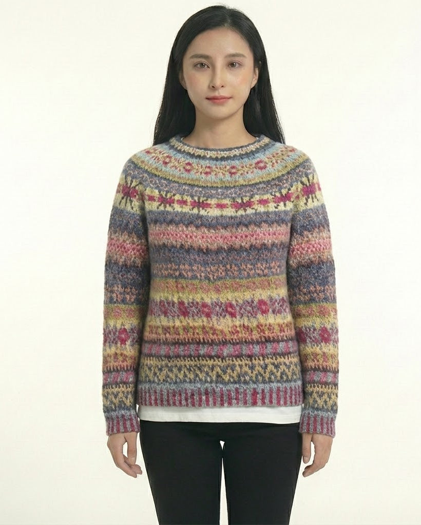 這款中等重量的毛衣以柔和的粉彩色調與溫暖的土色調交織,創造出美麗的紋理和和諧的外觀。專為喜愛舒適與優雅的女性設計,這件作品為日常穿搭增添了溫暖、色彩和精緻的魅力。