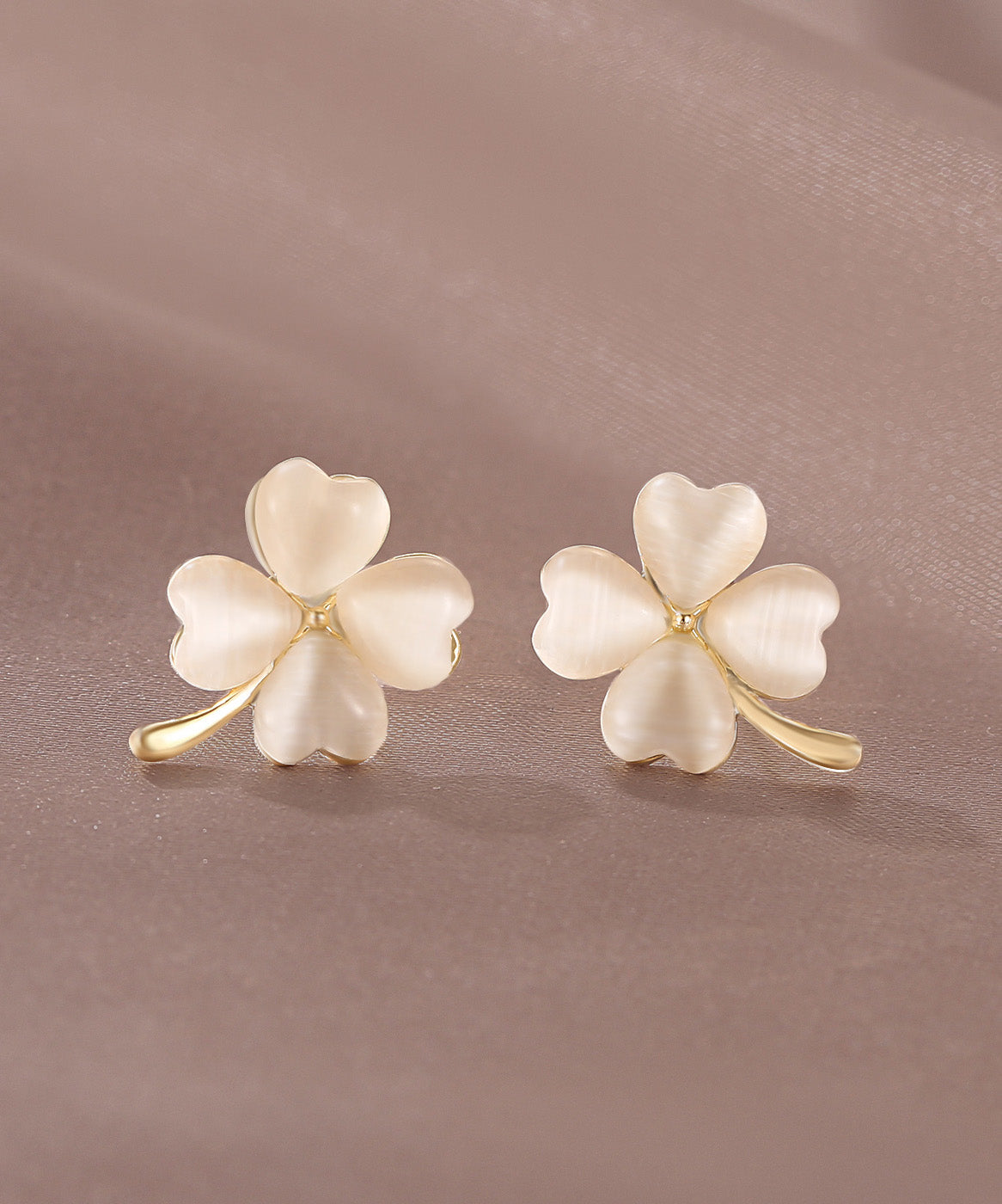 2025 新款金銅合金四葉草貓眼石耳釘 — 精緻優雅飾品,展現細膩質感與品味風格