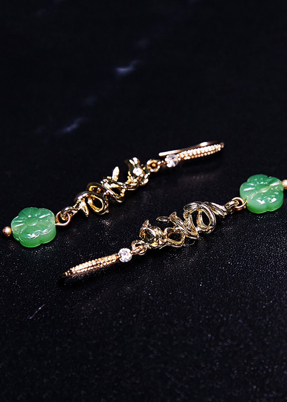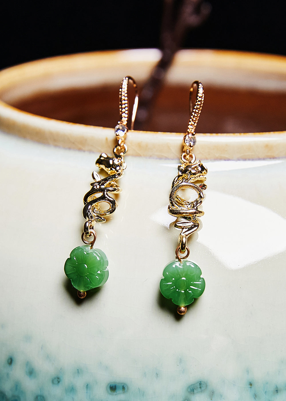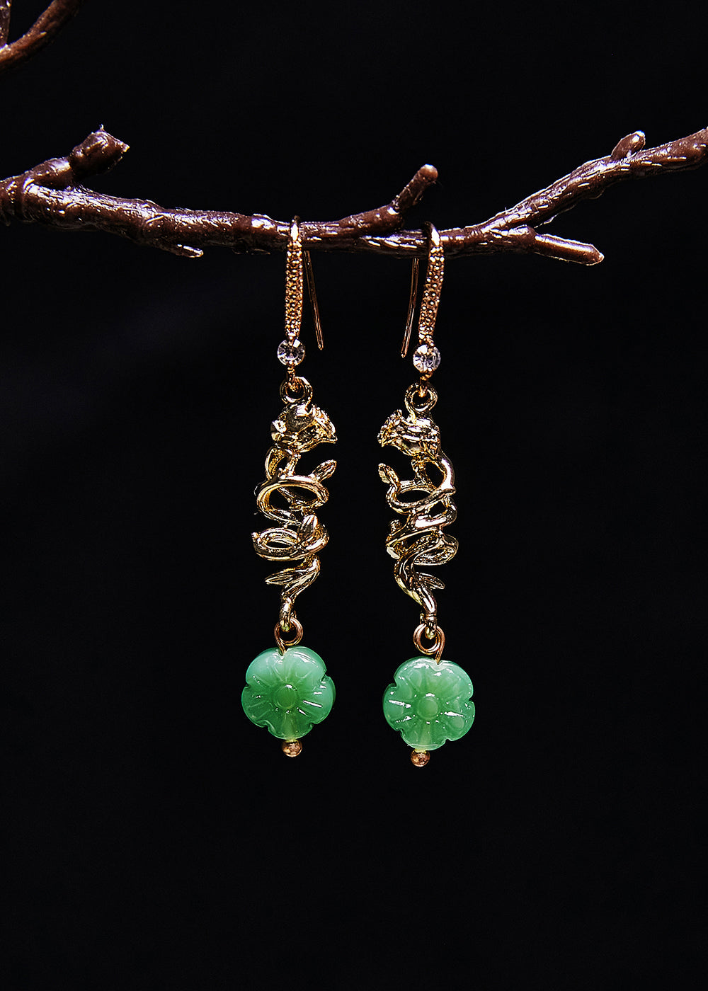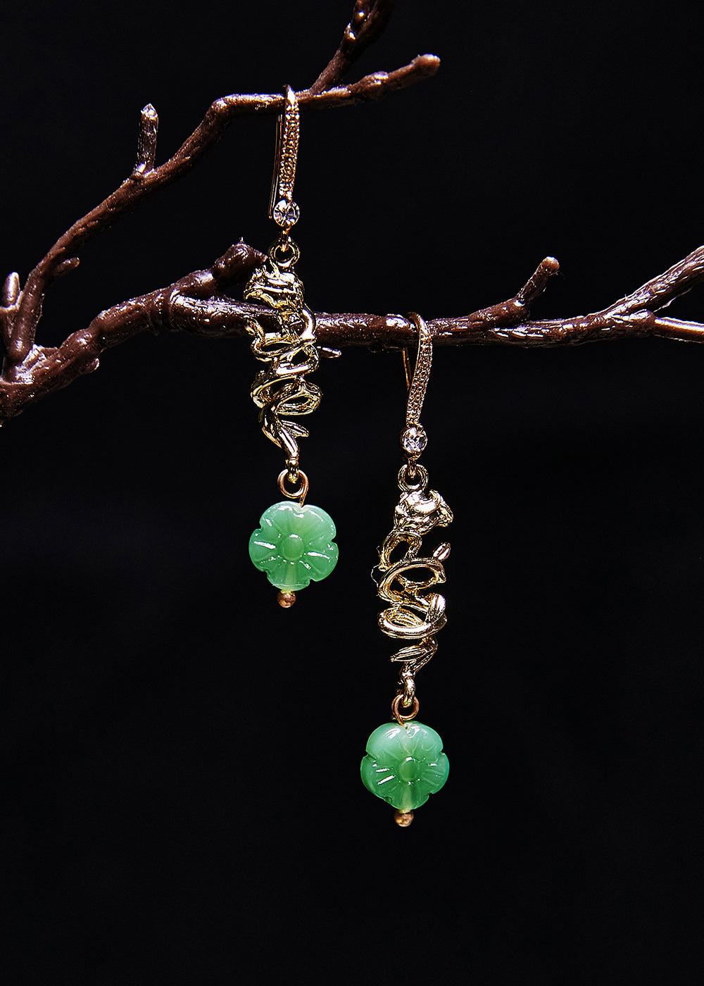 精緻綠色向日葵玉金飾垂墜耳環 — 精緻優雅飾品,展現細膩質感與品味風格