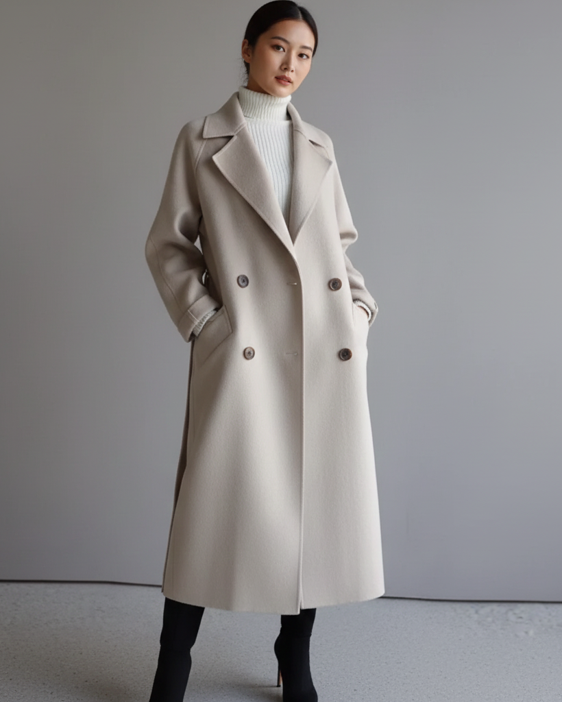 Zia | 經典羊毛外套 是優雅與舒適的完美結合。長版剪裁、寬翻領和雙扣設計,這件外套為任何造型增添了精緻的結構感。設計採用柔和的中性色調,這是一件多功能的單品,無論是休閒層疊還是精緻的城市造型,都能輕鬆駕馭。